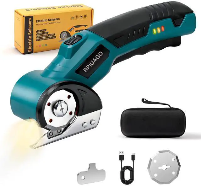 High Carbon Steel, 8.07 inches, Rpiuago, Cardboard Cutter Electric,, Electric scissor unit, USB Charging cable, Rotary blades, Metal wrench,Storage case, Battery Powered, true