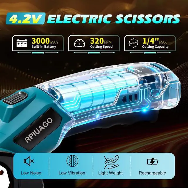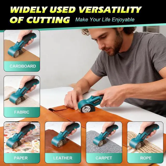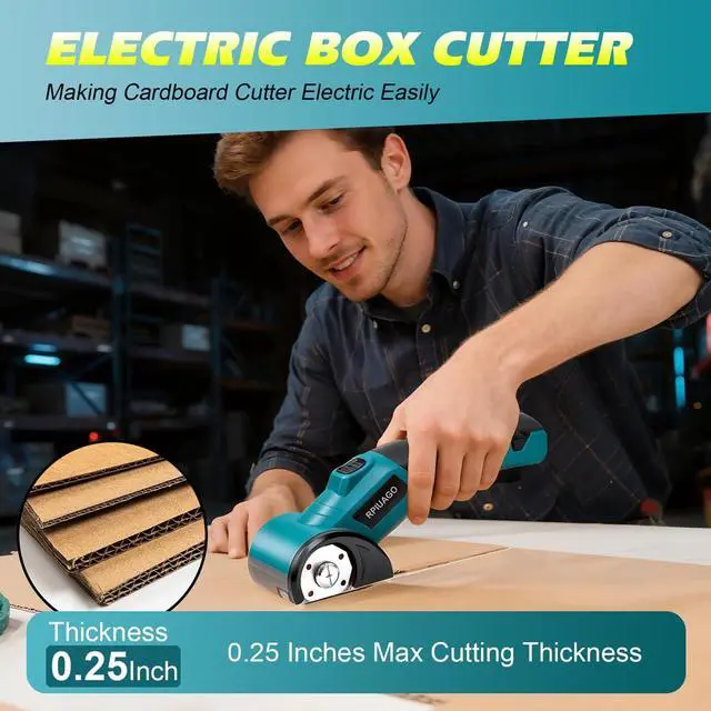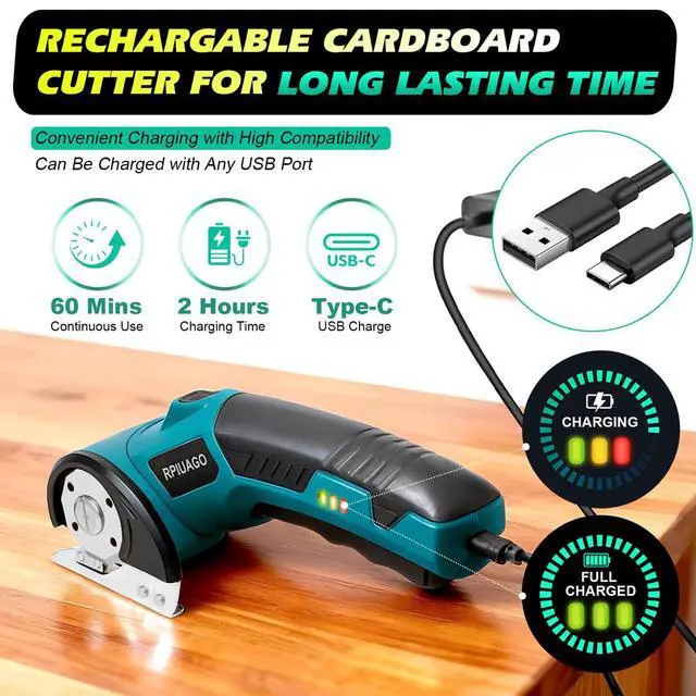 Long-lasting Runtime & Powerful PerformanceEquipped with a 3000mAh rechargeable battery, this 4.2V blue rechargeable electric scissors deliver up to 60 mins of continuous operation. It supports USB Type-C fast charging, reaching full power in just 2 hours. The cardboard cutter electric powered by a high-efficiency brushless motor running at 320RPM with low noise, which generates over 50N of cutting force, effortlessly slicing through max 0.25 inch/6mm thick cardboard, leather, plastic, carpet, fabric and more material. With 50% more power than ordinary electric box cutter for cardborad.