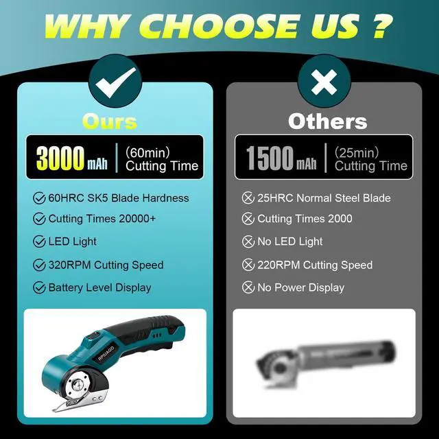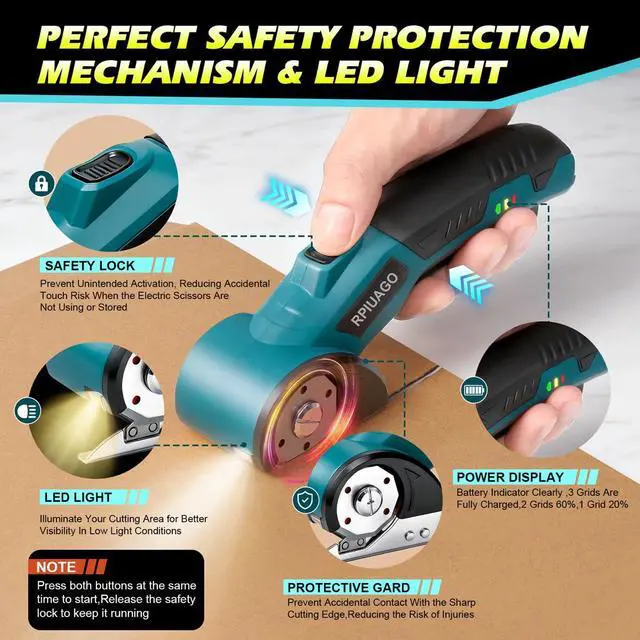 Industrial-Grade Self-Sharpening Blades , Stays Sharper & LongerThis blue cordless electric scissors is crafted with SK5 high-carbon steel blades (63HRC), and the blades for electric cardboard cutter heavy duty feature a self-sharpening design that withstands over 100,000 cuts without grinding. The quick-change blade mechanism ensures long-lasting, razor-like sharpness, perfect cardboard cutter tool for high-frequency, heavy-duty cutting tasks, like cardboard box cutter, fabric cutter,carpet cutter.