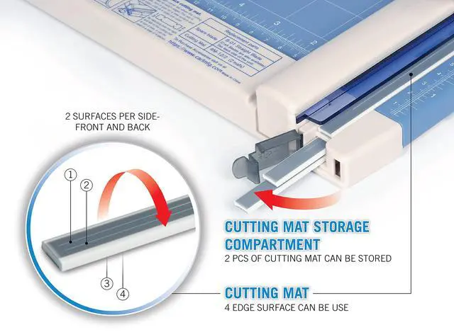 - Keep your extra blades in a safe and secured storage compartment located on back of the paper trimmer.
