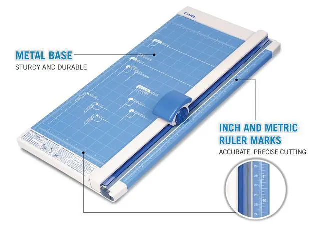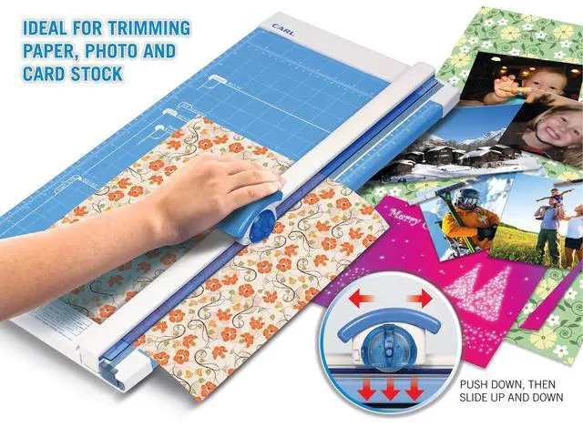 When you need to trim paper, photos or other material, the CARL Rotary Trimmer will keep lines straight, accurate and speed up your projects. While guillotine style cutters are popular, rotary trimmers offer a number of advantages for many crafters and artist. Rotary trimmers are also safer for all environments, especially for children since the blade is hard to reach. The CARL Rotary Trimmer also allows you to make continuous cuts on large pages and able to switch out blades from standard cuts to specialty edge cuts.