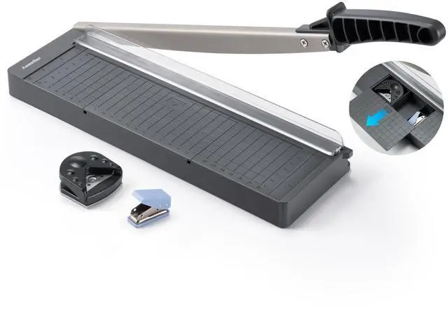 Aomether paper trimmer is simple and easy to use. Built with a sturdy plastic base, it's also light enough for easy transport.The guillotine paper cutter carries a corner cutter and hole punch, can satisfy various trimming needs, cutting cardstocks,cardboards,vinyl papers, photos, pictures, business cards, labels, and more for scrapbooking and paper DIY handicraft projects,ideal for use at offices, homes, printing shops, photo studios and so on.