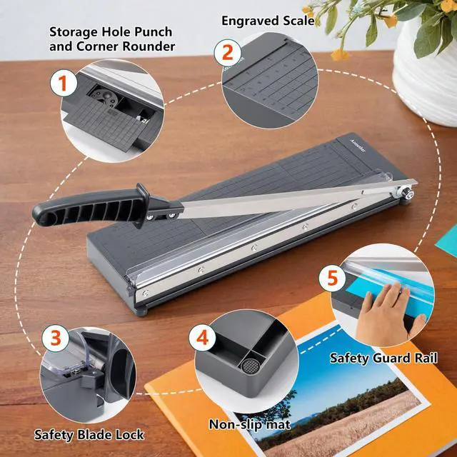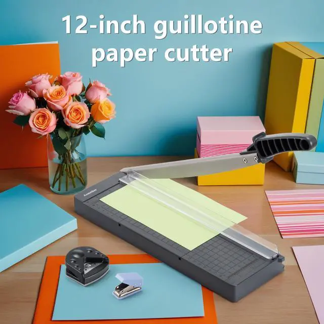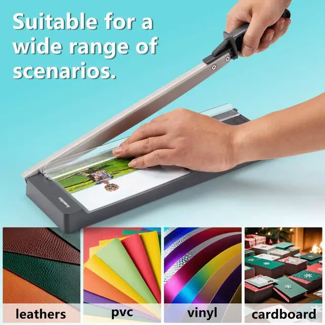 • Wide ApplicationErgonomically designed arm and long handle for greater ease when cutting paper. Cutting length is 12 inches and up to 8 sheets of 20 lb. paper at a time,ideal for use at offices, homes, photo studios and so on