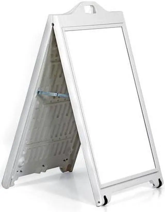 Sidewalk A-Frame Sign is made of durable plastic for indoor or outdoor use. This A-frame is double-sided and holds two 24 w x 36 h signs. Place your marketing information or graphic on both sides of the A-Frame to maximize your advertising opportunity. The sidewalk sign's wheels and handle make this item very portable and easy to transport. The sign can be securely anchored in place by adding dry sand on each side (up to 5 lbs. per side). The anti-glare transparent cover lens protects and preserves your graphic from being damaged by the elements.