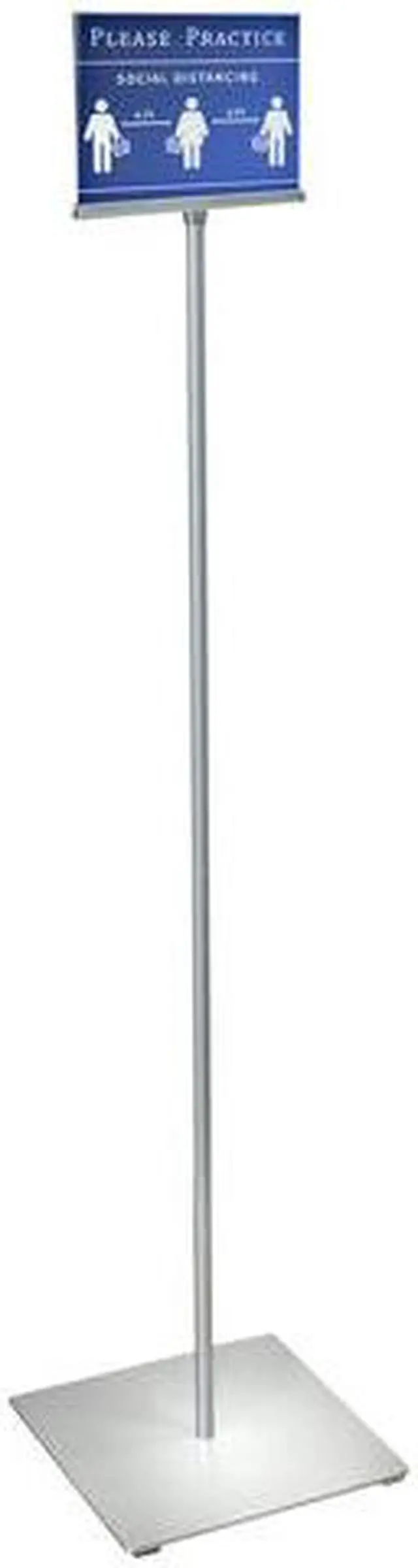 Azars Pedestal Two-Sided Sign Hldr Stand on Square Metal Base is perfect to display graphics, advertisements, promotions, and social distancing messages in stores, lobbys, hospitals, medical facilities, schools, offices, cafes, or anywhere a sign is needed. With a small footprint you can get your message or promotional information right in front of your target audience. Each unit comes standard with a Double Sided Acrylic Frame, Metal Pole, and Sturdy Metal base with rubber bumpers on the bottom. Easy assembly and top Loading design for inserting graphic.