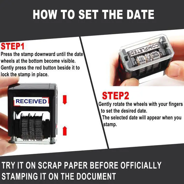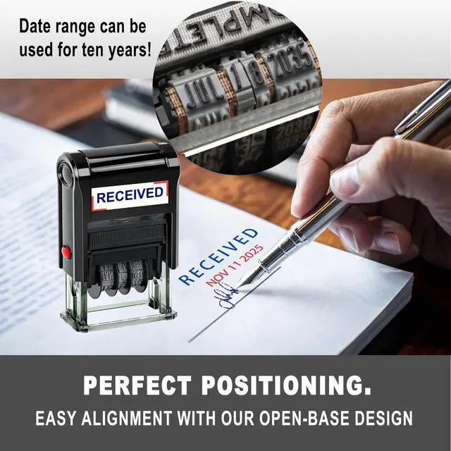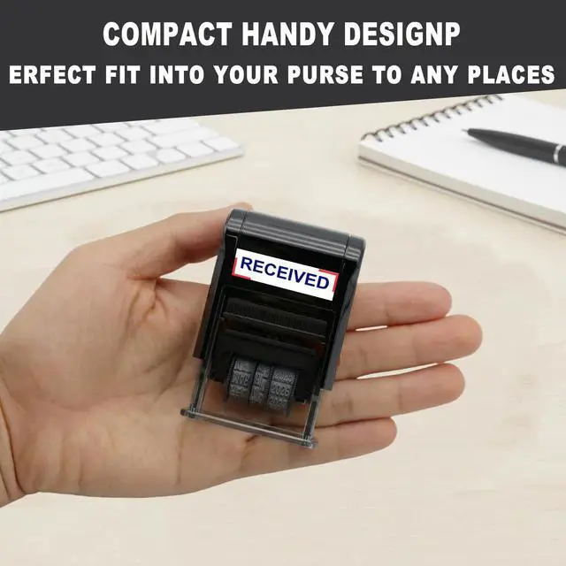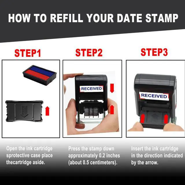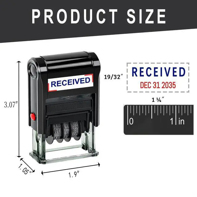 Product Description: Self-Inking Date Stamp Achieve a clear and crisp impression every time with our Self-Inking Date Stamp. Designed for efficiency, this stamp features an impression size of approximately 19 /32x 1.1/4inch in the US format of MMM-DD-YYYY, Multiple imprint colors are available Replace the ink cartridge easily for thousands of clear impressions, ensuring you never run out of ink when you need it most. With a convenient adjustable date feature, you can set it for up to 10 years ahead. Crafted from solid, durable materials, this stamp is ideal for frequent use and can handle rapid, repeated stamping without wear Perfect for offices, home organization, or personal use, this self-inking date stamper is a reliable tool for all your dating needs