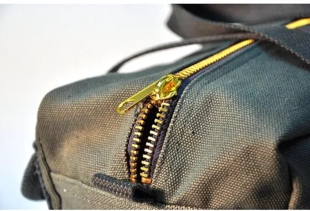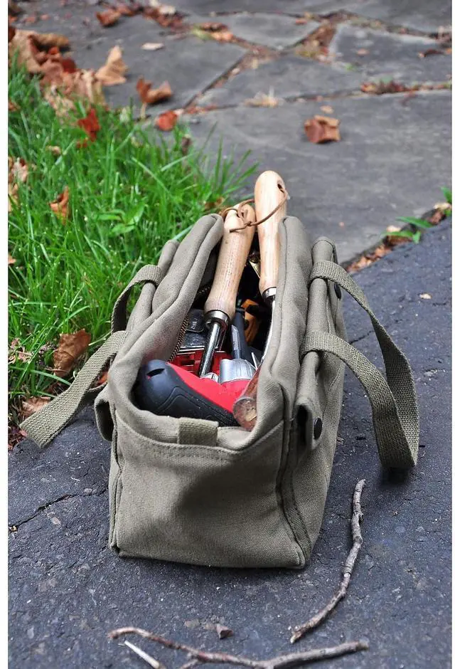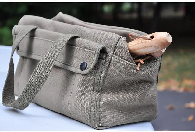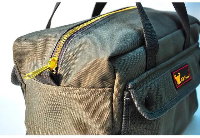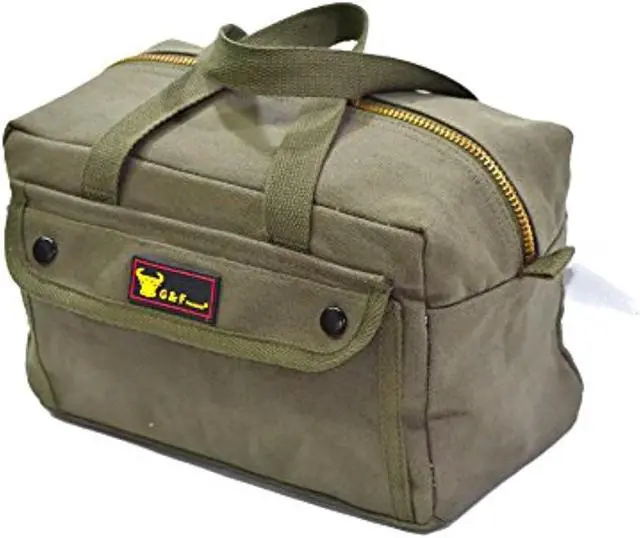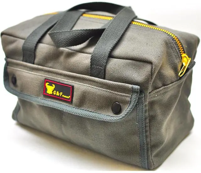 This heavyweight canvas mechanic's tool bag from g & F will keep you organized and ready at a moment's notice! the interior is spacious for larger tools, with 4 tool pouches on the sides to keep your other gear neat and orderly, the other side contains two larger pouches. The exterior has a large pocket on each side which closes with snap closures for paperwork, pens, or other accessories you might need. The bag shuts with a large brass zipper and can be carried by the two durable handles in the center.