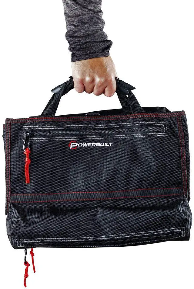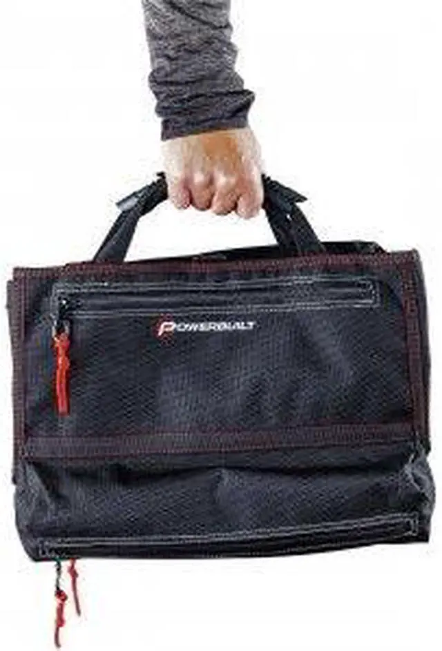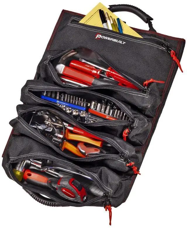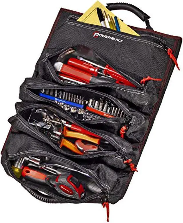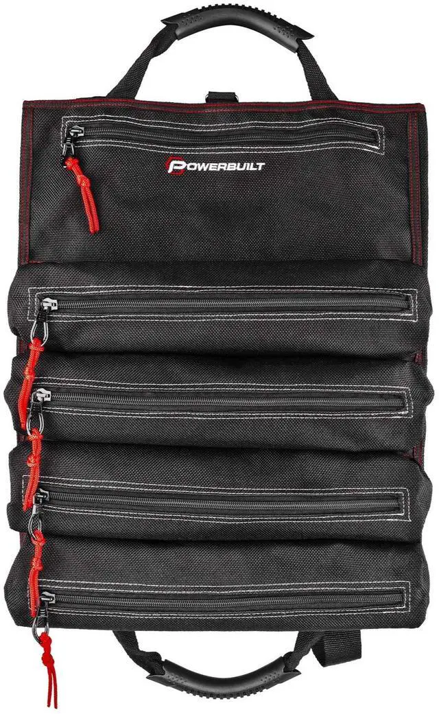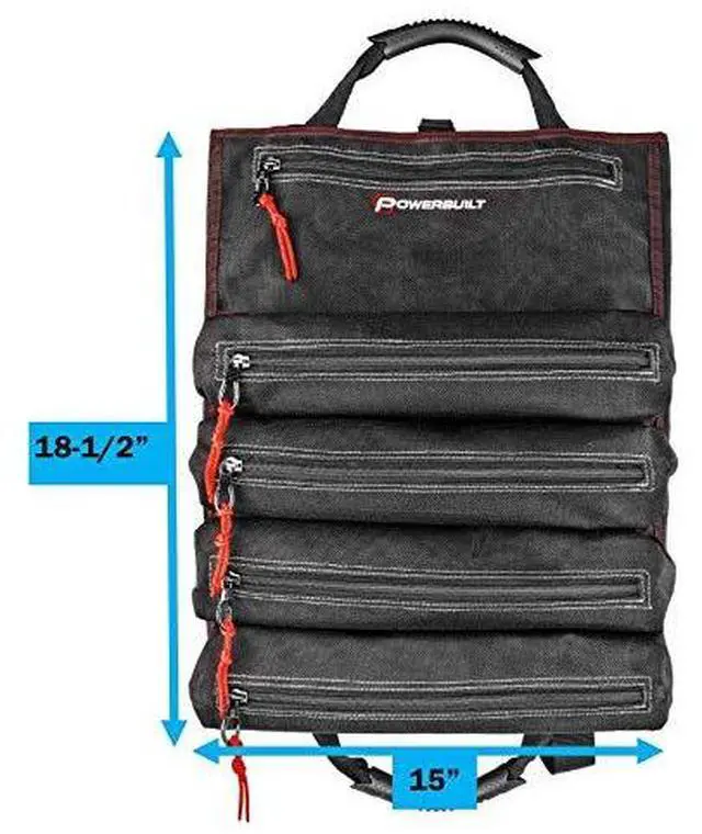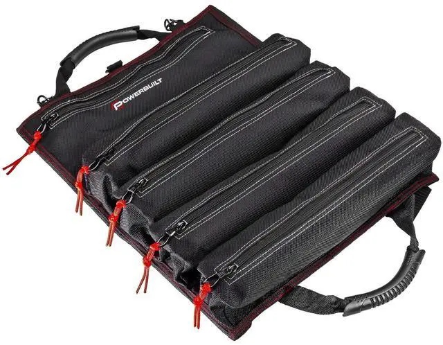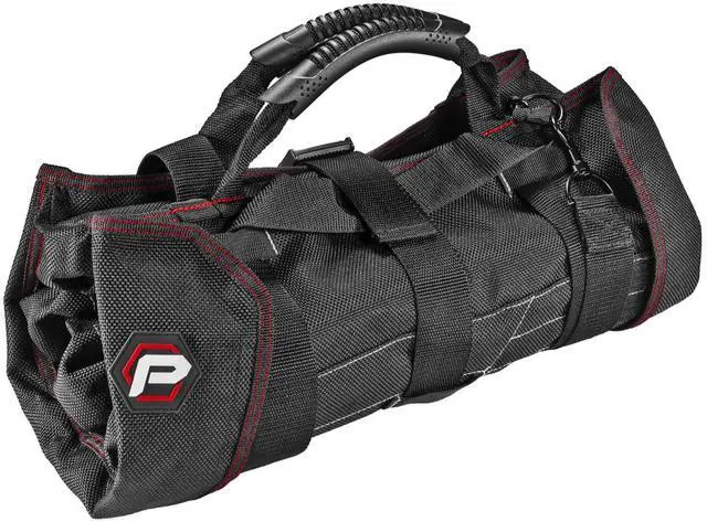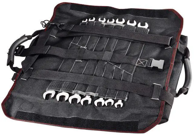 The carry handles include padded rubber sleeves for added stability and comfort. This beefy tool roll is constructed of heavy-duty 1200 denier nylon with reinforced seams and heavy duty zippers for maximum durability. Tools not included. -Heavy-Duty tool roll pouch constructed of premium 1200 Denier Nylon, with reinforced stitching and heavy duty zippers-5 Zippered storage pouches for organizing tools for EDC, work tasks, roadside and trailside repairs-14 slots for storing wrenches, socket accessories, screwdrivers, zip-ties, etc. -Built-in strap for hanging, dual closure latches and rubber-coated web carry handles