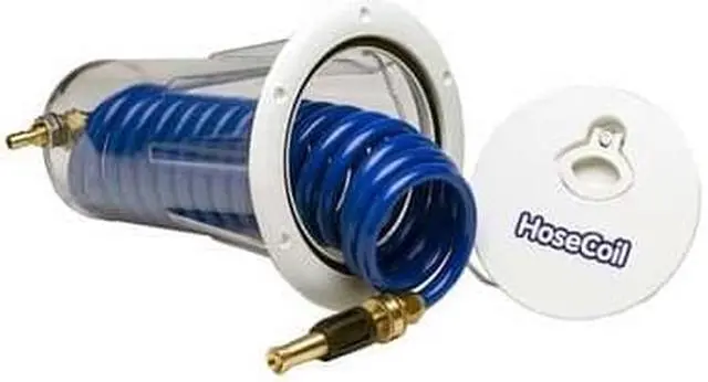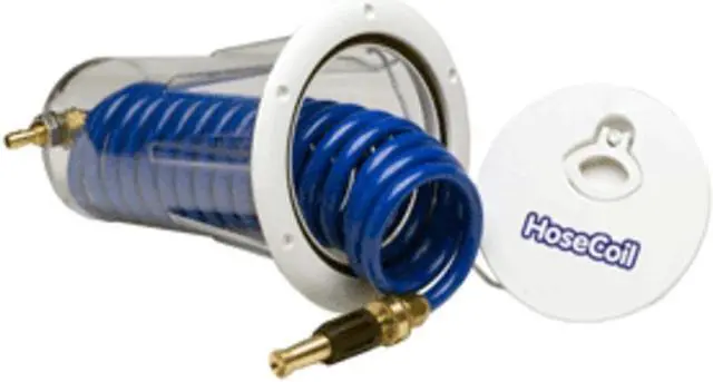Flush Mount Enclosure with NozzleFor cockpit or any onboard washdownThe highest quality wash down system on the market, HoseCoil's Flush Mount Enclosure includes a quick release lid for hiding and protecting a solid blue 15' HoseCoil. HoseCoil is constructed of high performance polytherester material. Featuring solid brass fittings and an adjustable brass nozzle with a rubber grip and rubber tip for fiberglass protection. HoseCoil is designed to connect directly into the boat's internal pressurized water system.