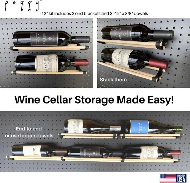 The Peggy pegboard organizer kit is a hook and dowel system using 3 12 dowel rods. The dowel rods are inserted into 2 semi-circular pegboard hooks. The 12 kit is then insert into pegboard as a storage accessory. The system is designed as storage for a variety of tapes, ribbons, wire spools, solder, and other round tools typically used in crafts, gift wrapping, electronics repairs, or on a workbench. The Peggy helps save space and reduce clutter in craft rooms, garages, work benches, electronics repair centers, and many other spaces.