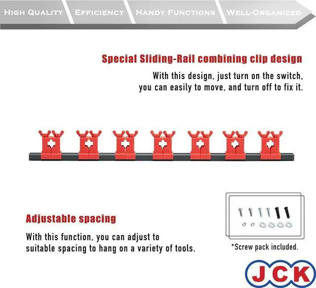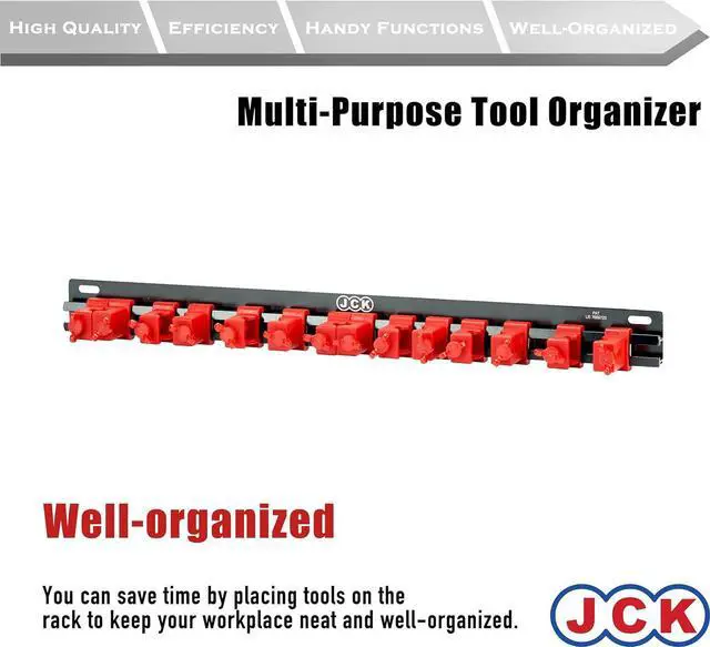With double side euro hole design, you can easily hang it on and also have 360 degree rotary position can switch the size you need JCK Socket Organizer Inserted iron ball and spring loaded iron ball bearings on each studs hold sockets firmly. And, it can ensure your sockets which are well-positioned and avoid slippage. Keeping your workplace neat and well-organized is not that so difficult.