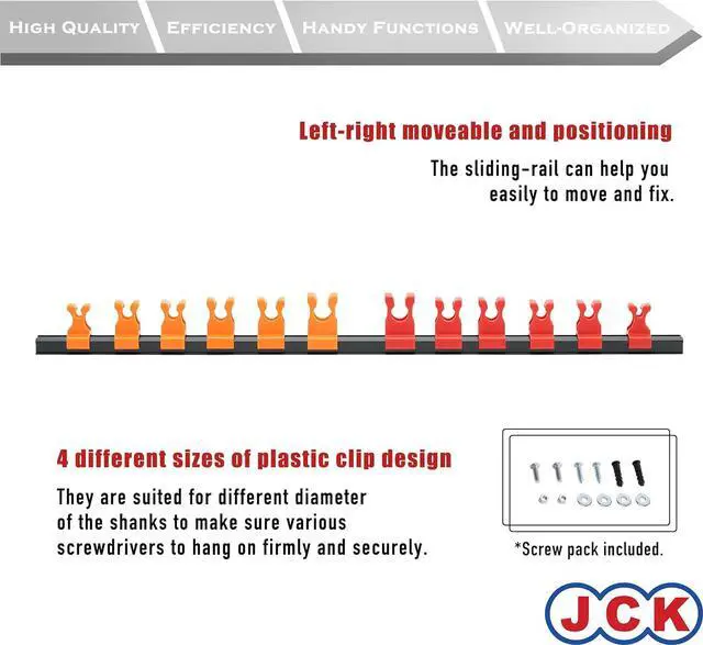 With double side euro hole design, you can easily hang it on and also have 360 degree rotary position can switch the size you need JCK Socket Organizer Inserted iron ball and spring loaded iron ball bearings on each studs hold sockets firmly. And, it can ensure your sockets which are well-positioned and avoid slippage. Keeping your workplace neat and well-organized is not that so difficult.
