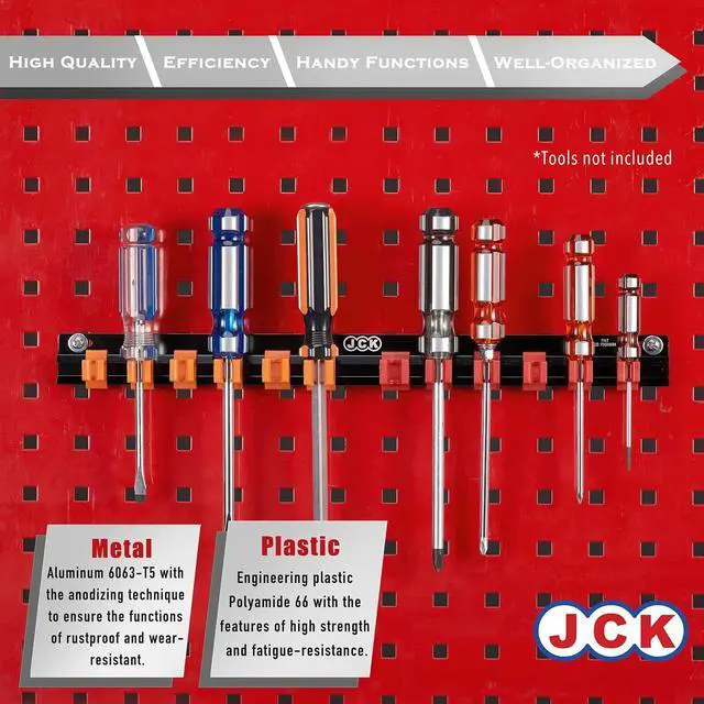 JCK is one of the leading manufacturer of tool organizer in Taiwan. With over 40 years of profound experiences, we are recognized by traders all over the globe. JCK has developed various molds for tool organizers. We wants to ensure our products' quality, so we mainly introduced Japanese-made plastic-injection facilities for molding and adopted 6063-T5 grade aluminum and engineering plastic PA 66 (Nylon 66) as our main materials. JCK provides various options and customize services to fulfill customers' favors.