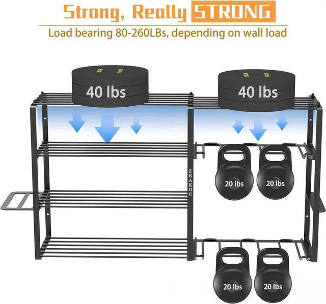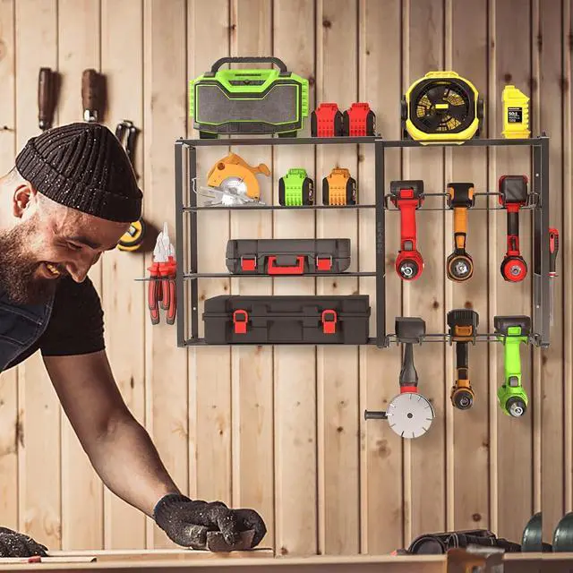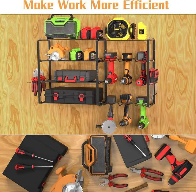 Our tool organization and storage are made of high quality DIA 1.57" - 2.36" carbon steel, net weight up to 9.37LBS. Each shelf has a load capacity of up to 80-260Lbs, depending on the load bearing wall. Each drill holder has a load capacity of 20Lbs and is spaced 1.65" apart for easy hanging. Sprayed with a layer after electric surge, our tool holder provides more wear resistance.