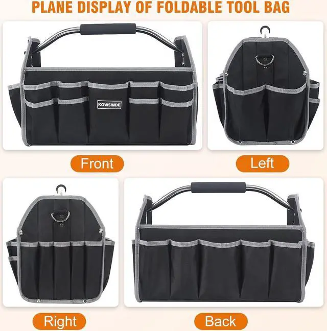 The tool bag can store screwdrivers, wrenches, electric drills, tape measures, pliers, etc.; Featuring a foldable design for easy storage. It is an essential tool bag for electricians.