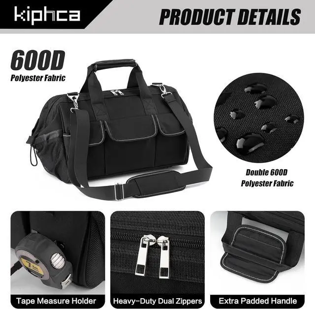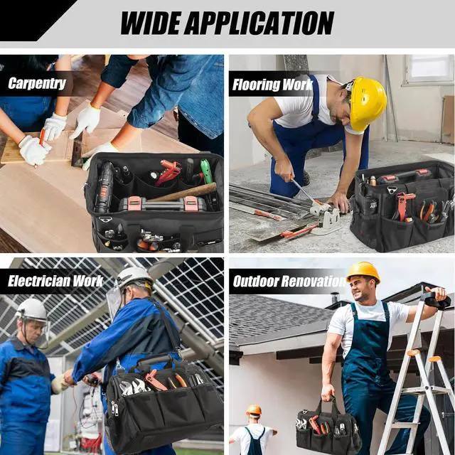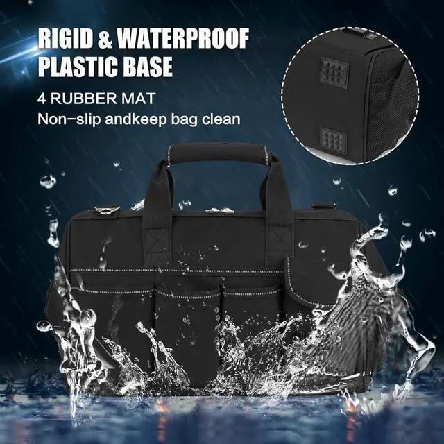 Waterproof Base & Durable Handles & Straps, Working outdoors can be unpredictable, don't worry about this tool bag getting damaged by moisture or harsh conditions. The durable waterproof base effectively shields the bag and its contents from puddles, mud, and even light rain, keeping everything clean and dry. Coupled with the padded handle and adjustable shoulder strap, which offer superior comfort even under heavy loads, this tool bag organizer is the ultimate companion for any jobsite.