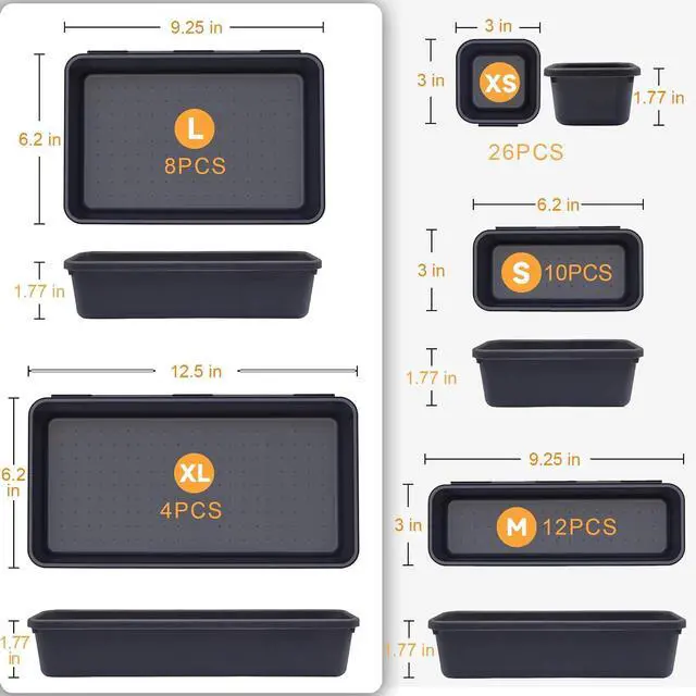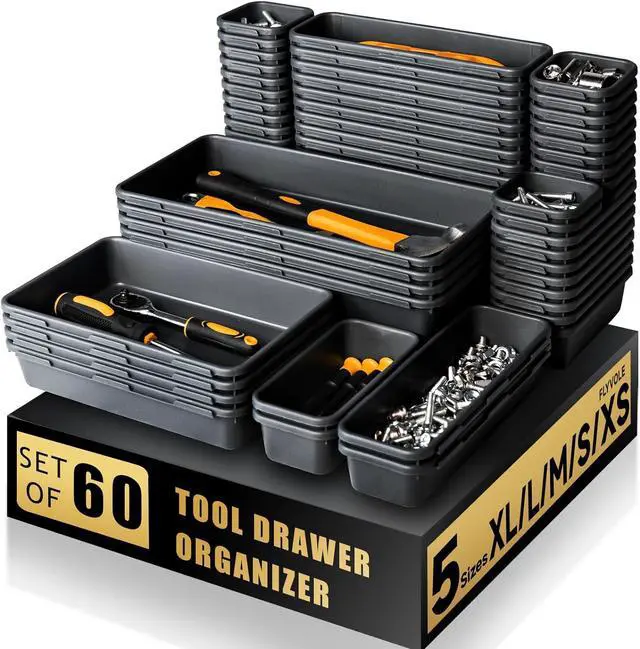 [60 Pack & 5 Sizes] - Our tool box organizer bins include 60 trays:4 x XL size (12.5x6.2x1.77in), 8 x L size (9.25x6.2x1.77in), 12 x M size(9.25x3x1.77in), 10 x S size(6.2x3x1.77in), 26 x XS size(3x3x1.77in).