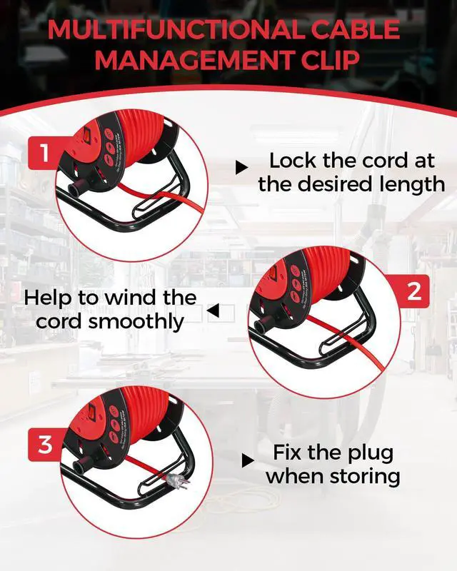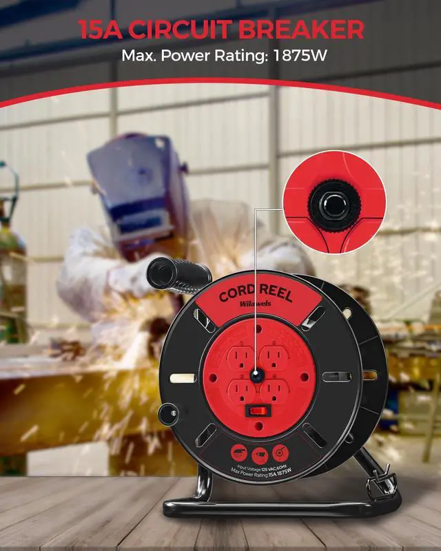 This open storage reel features 4 grounded outlets and a 15A circuit breaker, allowing you to connect multiple devices at once.