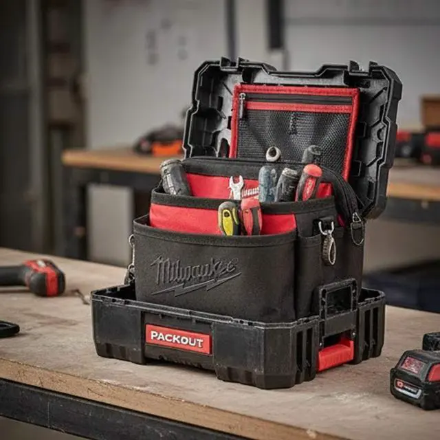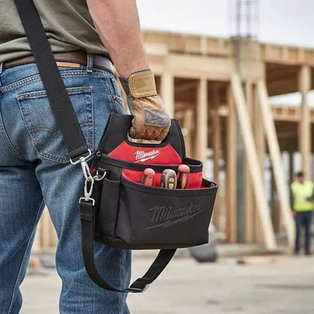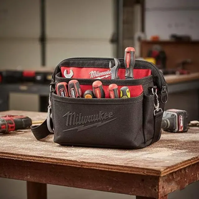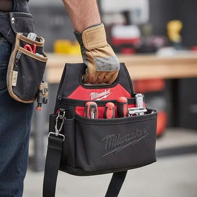 The MILWAUKEE Electricians Work Pouch is built for professional tradesmen who need durability, organization, and portability. Constructed with 1680 Denier Nylon, riveted seams, and all-metal hardware, this pouch features 15 pockets to organize tools, a stable base that keeps it upright, and a puncture-resistant pocket for sharp items.