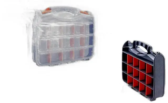 Two Sided Plastic Storage Organizer Case with 30 Adjustable Compartments - Double the storage customizable to your needs Ideal for Sorting and Organizing Crafts, Sewing Supplies, Parts, Hardware, Threads, Bobbins, Snacks, Nuts and Bolts Customize the length of each compartment with removable dividers from 2 3/8 inch to 12 inches The Portable Carrying Case has a built in handle allowing to bring your organization with you Features double latches on both sides of the plastic case to keep it securely closed for your convenience Organized Sturdy Plastic Storage Box with a Convient 2-Sided Carrying Case Design for all of your DIY Craft, Sewing, and Small Part Sorting 2-Sided Customizable Storage Organizer with over 30 Compartments for Sorting Small Parts, Crafts, Sewing Supplies, Hardware, and More! Multipurpose on the go storage Durable and Useful Sturdy construction tested to support 300lbs allowing for alternate use as a tiny step stool, but we do not recommend it.
