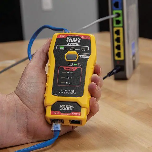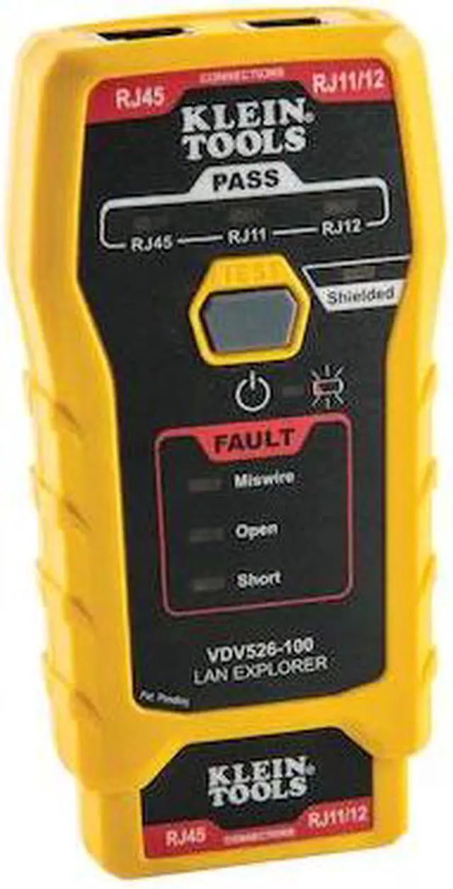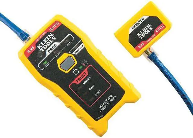 LAN Explorer™ Data Cable Tester with RemoteThis simple, compact data cable tester for RJ11, RJ12 and RJ45 terminated voice and data cables for Miswires, Open-Faults, Short-Faults and Shield. Instant LED responses indicate cable status. The test remote stores securely in the tester body. The Auto Power-Off feature shuts the tester down automatically to save the 9V battery (included).Features:Single button testing of RJ11, RJ12 and RJ45 terminated voice and data cablesTests CAT3, CAT5e and CAT6/6A cablesFast LED responses indicate cable status (Pass, Miswire, Open-Fault, Short-Fault, and Shield)Test remote stores securely in tester bodyCompact tester easily fits in your pocketAuto Power-off feature to conserve battery life (9V included)Low battery indicatorReplacement remote (VDV999-150) available (sold separately)Specifications:Type: Twisted Pair, DATA, Voice, LAN Application: Cable TestingSpecial Features: LED responseCable Type: CAT3, CAT5e, CAT6/6AOverall Length: 5" (127mm)Overall Height: 1.25" (32mm)Overall Width: 2.5" (63.5mm)Material: Plastic and Stamped MetalBatteries: (1) 9VDisplay: LEDIncluded: Tester, Remote, 9V BatteryWarnings:Always wear approved eye protection.Read all safety Information before using the product.Carefully read all instructions.Designed for use on unpowered/dark cable systems.Do NOT connect to live AC power.For indoor use only.WARNING: This product can expose you to chemicals which are known to the State of California to cause cancer, birth defects or other reproductive harm. For more information go to P65Warnings.ca.gov.