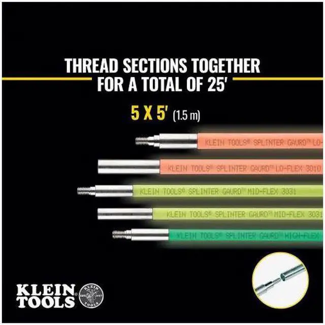 Klein Glow Fish Rods are the perfect solution for running wires through drop ceilings, attics, floors, walls and crawl spaces. This Multi flexibility set contains various hi, lo and mid-flex rods to build the optimal rod combo to navigate any run. The Splinter Guard coating glows bright in various colors to quickly identify the best flex for the job and improves visibility in low-light. This 25 ft. rod includes a bullet, hook, magnet and chain attachment for extending, grabbing and retrieving.
