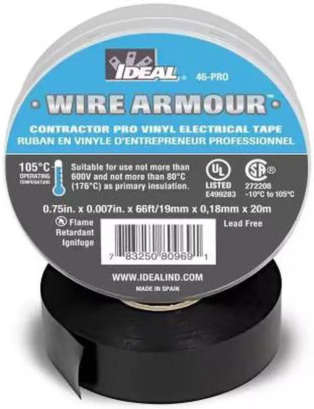 When performance matters, you can count on IDEAL Wire Armour Contractor Pro vinyl electrical tape to insulate and protect, stretch with strength and bond in the toughest conditions and most critical applications at a great value. Commercial electric vinyl tape with blue core technology that provides high elasticity, that is flame retardant, high UV resistant that is impervious to water, oil, acids, alkalis and a wide variety of corrosive chemicals. Primary vinyl electrical tape use for insulation of electrical splices up to 600-Volt.