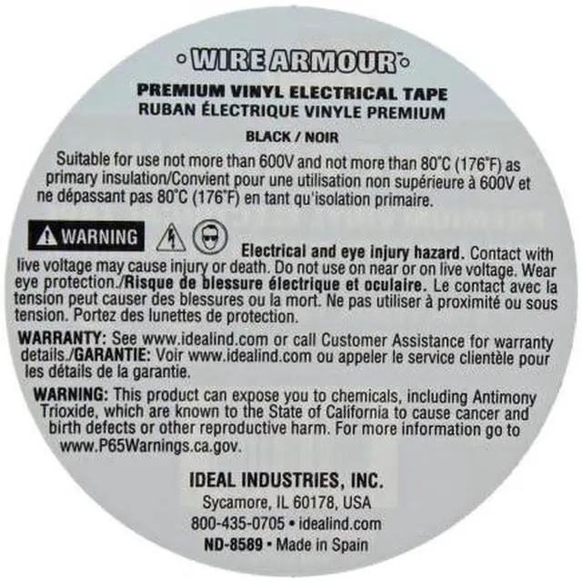 When performance matters, you can count on IDEAL Wire Armour premium vinyl electrical tape 33 Black to insulate and protect, stretch with strength, and bond in the toughest conditions and most critical applications at a great value. Commercial electric vinyl tape with blue core technology that provides high elasticity, that is flame retardant, high UV resistant that is impervious to water, oil, acids, alkalis and a wide variety of corrosive chemicals. Primary vinyl electrical tape use for insulation of electrical splices up to 600-Volt.