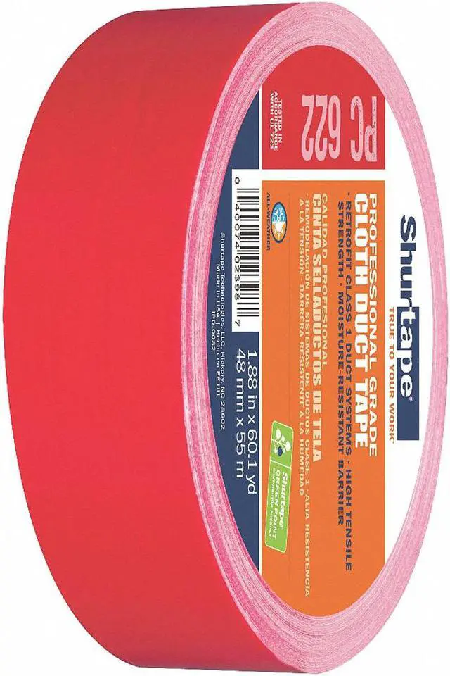 Adhesion to Steel 54 oz/in, Tape Brand SHURTAPE, Clean Removal Time Not Applicable, Construction, General Maintenance and Repair, Environment Indoor/Outdoor, Imperial Tape Length 60 1/8 yd, Imperial Tape Width 1 7/8 in, Continuous Roll, Series PC 622, Tape Adhesive Material Rubber, Tape Backing Material Polyethylene Coated Cloth, Tape Color Red, Tape Sub-Type General Purpose Duct Tape, Tape Thickness 12.5 mil, Duct and Repair Tape, Maximum Tape Performance Temperature 200 Degrees F. This item has been restricted from sale in the following state (s): []