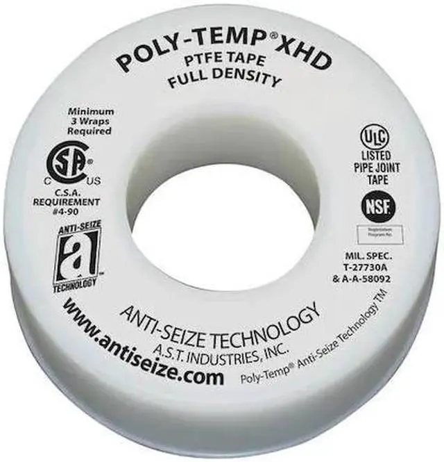 Thread Sealant Tape, Specific Sealing Application General Purpose Thread Sealing, Series POLY-TEMP (R) XHD, Overall Width 1 1/2 in, Overall Length 43 ft, Minimum Operating Temperature -400 Degrees F, Maximum Operating Temperature 550 Degrees F, Maximum Operating Pressure for Liquids 10, 000 psi, Maximum Operating Pressure for Gases 2, 000 psi, Maximum Linear Density 1.5 g/cc, Minimum Linear Density 1.2 g/cc, Color White, Tape Type Pipe Thread Sealant Tape, For Maximum Thread Diameter 1 1/2 in. This item has been restricted from sale in the following state (s): []