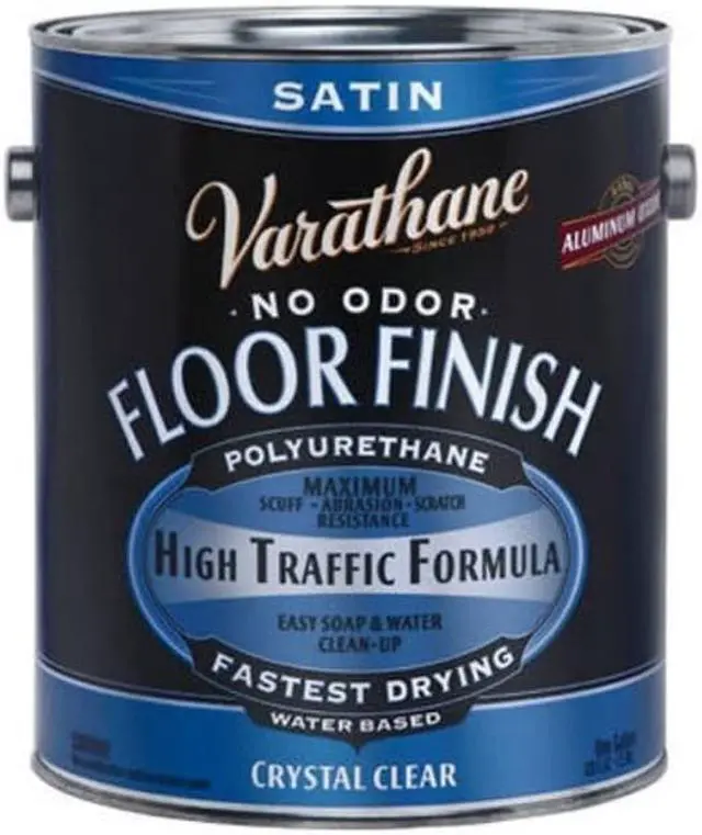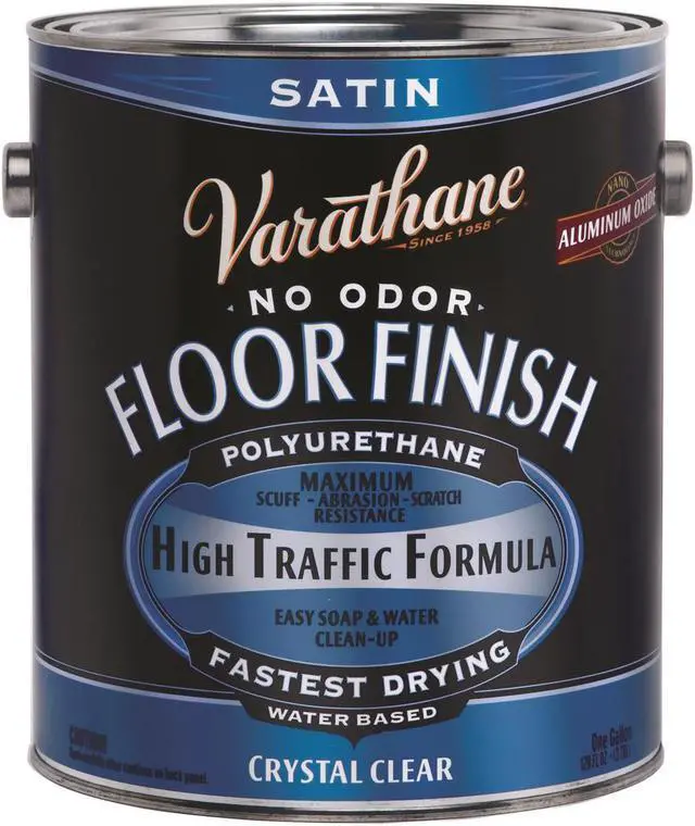 Varathane Floor Finish Paint, Water-Based, Liquid, Crystal Clear, Satin, 1 Gal Capacity, Can, Pigment: Aluminum Oxide, Amorphous Precipitated Silica, Vehicles: Acrylic Urethane, Glycol Ethers, Water Thinners, 400 - 500 sq-ft/Gal Coverage, 55 - 90 Deg F, 94 Deg C Flash Point, 266 g/l VOC, 1.011 Specific Gravity, Mild Odor/Scent, Applicable Materials: Wood, Application Method: Brush, Applicator Pad, Resists: Adhesion, Scuff, Scratch, Standards: USDA Acceptable, 2 - 24 hr Dry Time, For All Interior Stained, Bare or Painted Projects Such As Furniture, Doors, Cabinets and Trim