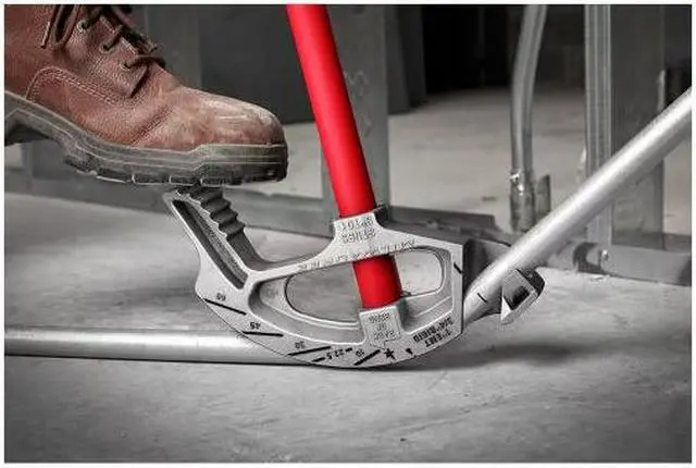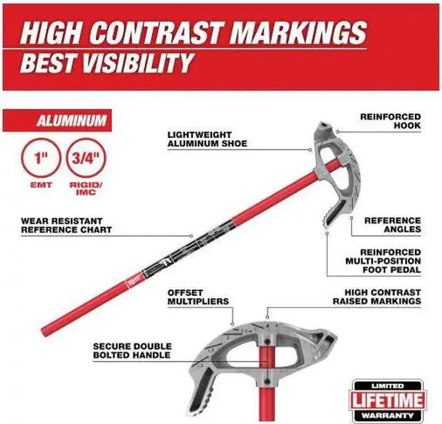 The Milwaukee 1 in. Aluminum Conduit Bender features high contrast markings for the best visibility allowing users to easily and accurately make bends. A reinforced hook and pedal and lightweight aluminum shoe provide users with added durability while a secure double bolted handle won't loosen after repeated use. The conduit pipe bender shoe features the most bending references as well as a wear-resistant reference chart for easier use. Offset multipliers are featured on the shoe while 30°, 45°, and 60° center of saddle bend notches and a back of 90° bend indicator allow users to easily and accurately bend conduit.