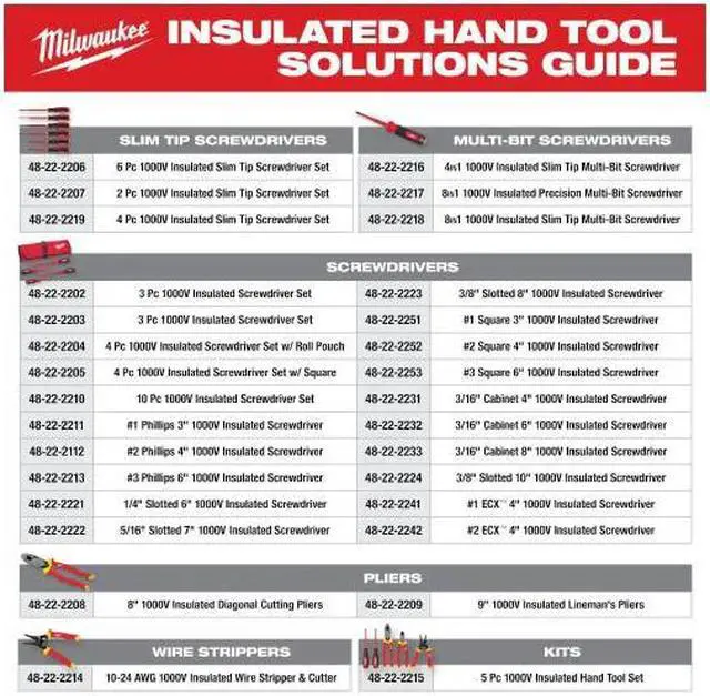 The MILWAUKEE® 5-Piece 1000V Insulated Hand Tool Kit includes key solutions for electrical work. The 1000V Insulated 9" Lineman's Pliers and 1000V Insulated 8" Diagonal Cutting Pliers both feature maximum leverage for easy cuts. The diagonal cutting pliers have a tapered nose for easier access and flush cuts. The 1000V Insulated Wire Stripper accurately removes insulation from 10-18 solid and 12-20 stranded wire. The 1000V Insulated Slim Tip Screwdrivers feature a flush insulation layer at the screwdriver tip - delivering easy access into tight spaces. The Milwaukee® 5-Piece 1000V Insulated Hand Tool Kit is UL classified and certified to IEC 60900 and ASTM F1505 standards for insulated hand tools and is backed by Milwaukee's Limited Lifetime Warranty.