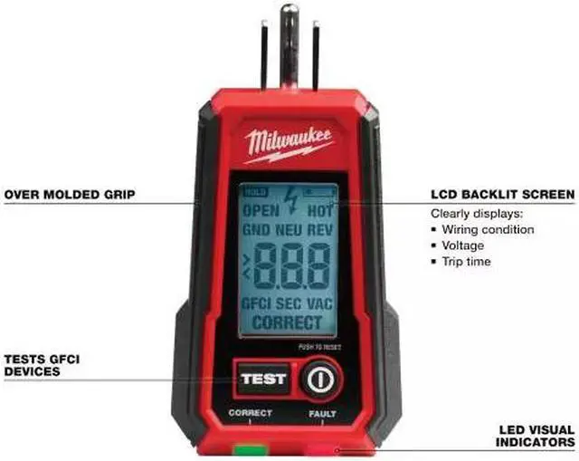 The Milwaukee Digital GFCI Receptable Tester is designed to reduce the risk of electrical shock generated from outlets. The over molded grip provides durability and comfort for all applications. Additionally, the visual indicator light turns on indicating the activation of the GFCI test, if functionally correctly. The LCD screen offers clear reading of the wiring conditions of an outlet, voltage, and trip time. LED visual indicators help determine the wiring conditions of an electrical outlet.