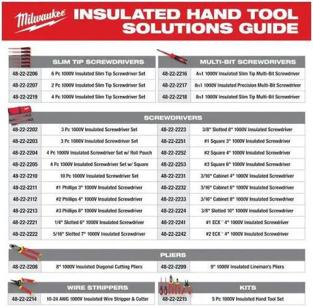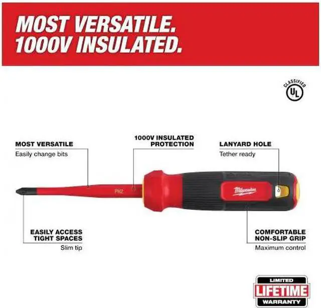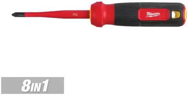 The MILWAUKEE® 8-in-1 1000V Insulated Slim-Tip Multi-Bit Screwdriver is more versatile and you can easily swap out bits. It features a flush insulation layer at the screwdriver tip delivering easy access into tight spaces. The 1000V-rated layer of insulation is flame-retardant and impact-resistant. The Milwaukee® 8-in-1 1000V Insulated Slim Tip Multi-Bit Screwdrivers feature a comfortable barrel grip handle and include common tip types such as Phillip's, Cabinet, and Square. These insulated screwdrivers are UL classified, are certified to IEC 60900 and ASTM F1505 standards for insulated hand tools, and are backed by Milwaukee's Limited Lifetime Warranty.