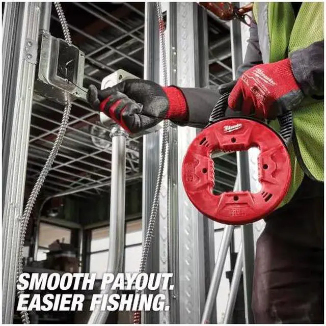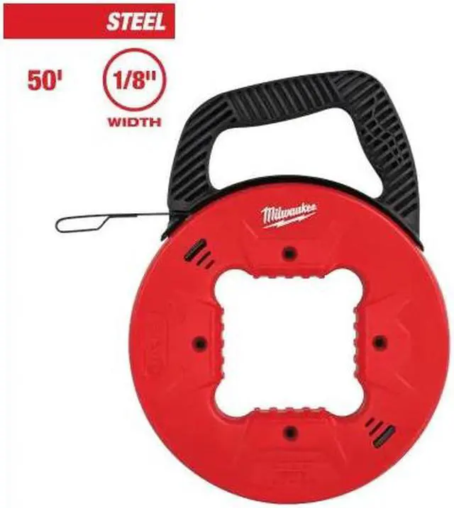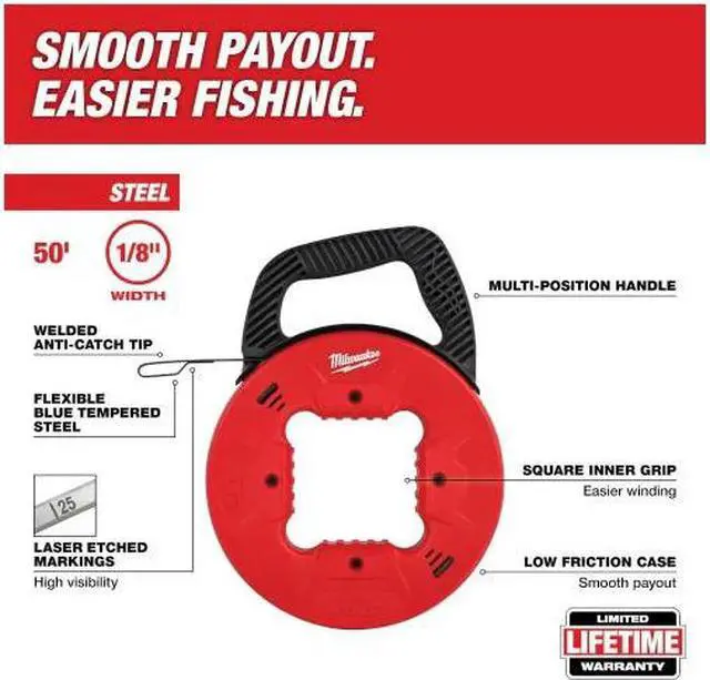 The Milwaukee 50 ft. 1/8 in. Steel Fish Tape features a low friction case providing users with smooth pauserst and easy rewind. High-visibility laser etched markings on the tape allow users to accurately measure depth and position. The blue tempered steel balances strength and flexibility for easier fishing. The fish tape features a multi-position handle allowing users to comfortably use the fish tape in any jobsite scenario.