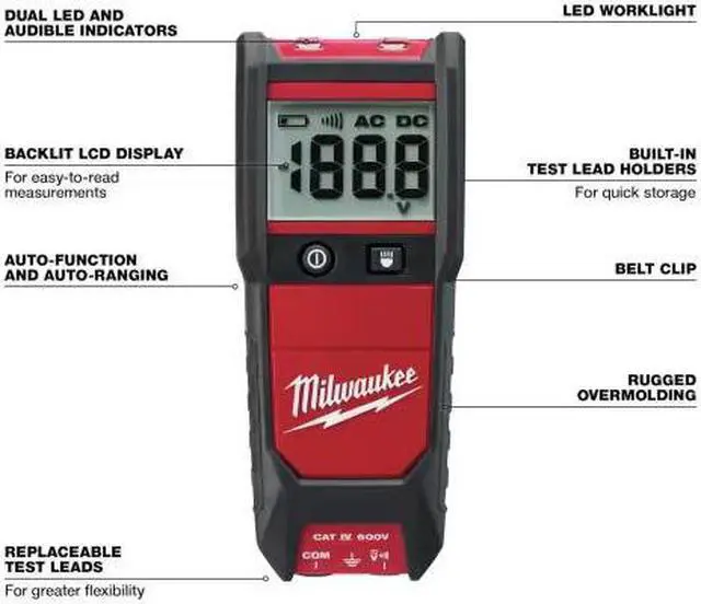The Milwaukee Auto-Voltage/Continuity Tester combines the features you get from high performance electrical meters into an accurate, simple, and productive tester. While traditional testers only indicate broad-Voltage ranges that mask electrical issues like-Voltage drops, the Milwaukee Auto-Voltage/Continuity Tester delivers measurements down to the decimal and displays them on an easy to read LCD. The tester also automatically determines whether to test for-Voltage or Continuity and is compatible with common threaded carrying and mounting accessories like belt clips and magnets. The LED work light provides visibility in low-lit areas and test lead holders conveniently store the probes for when the job is done.