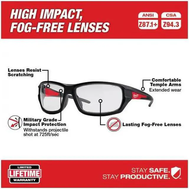 The three different output modes allow users to optimize their light output and runtime for up to 11 hours of runtime. Users can charge the REDLITHIUM USB batteries via Mirco USB while they are inside the light or swap it out with another REDLITHIUM USB battery for virtually no downtime. The USB Rechargeable ROVER Pivoting Flood Light is great for any trade professional and covered by a limited lifetime warranty. The Milwaukee Performance Safety Glasses are designed with High Impact, Fog-Free Lenses.
