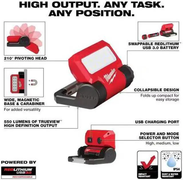 The MILWAUKEE USB Rechargeable ROVER Pivoting Flood Light offers best-in-class output in any direction and is powered by our REDLITHIUM USB. The compact LED floodlight offers 550 lumens of TRUEVIEW High Definition Output. The light head has 210° of rotation, allowing users to direct high output light to any work surface. A wide, magnetic base allows users to position the pivoting floodlight on common work surfaces or mount it to metal for hands-free task lighting. Its collapsible design fits into pockets and a built-in carabiner gives users the ability to clip it to tool organizers or straps for easy transport.