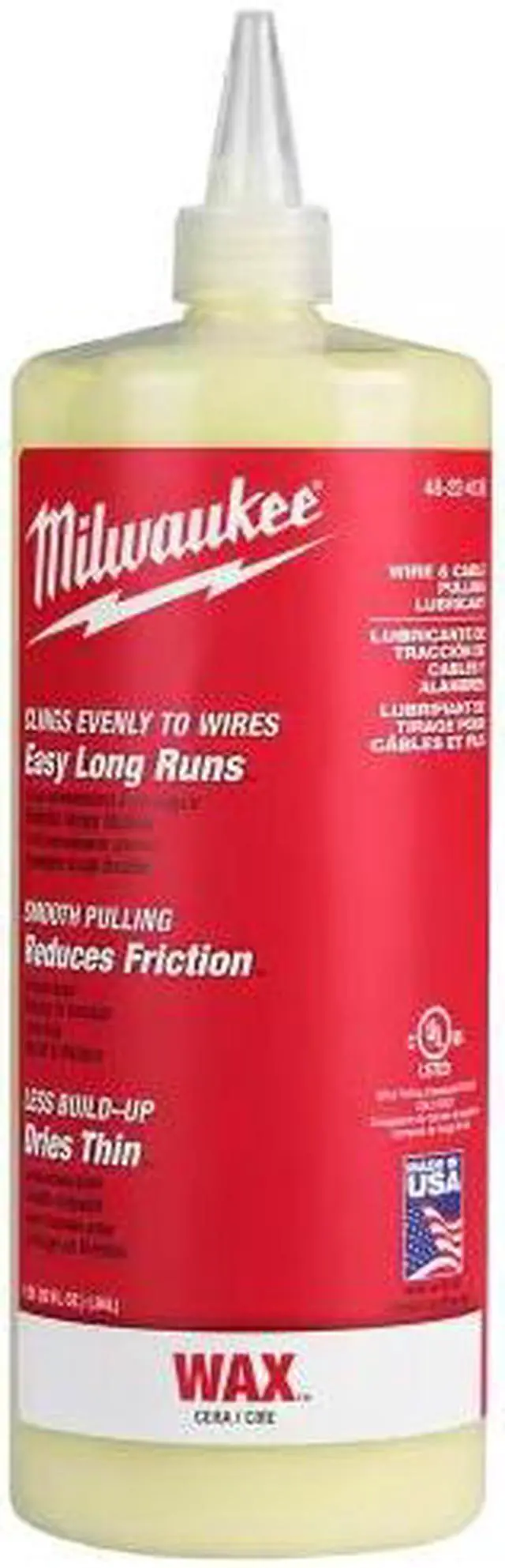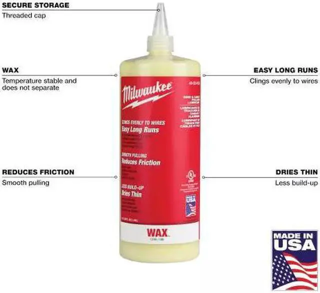 The MILWAUKEE Wire and Cable Pulling Wax Lubricant evenly clings to wires for easy long runs. The wire-pulling lubricant reduces friction for smooth pulling of wire and cable through conduit. The wax dries thin for less build-up on wires and in conduit. It is compatible with all cable types and remains stable from 32°F to 120°F.