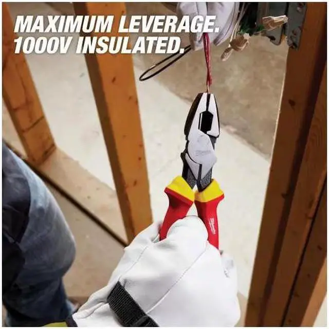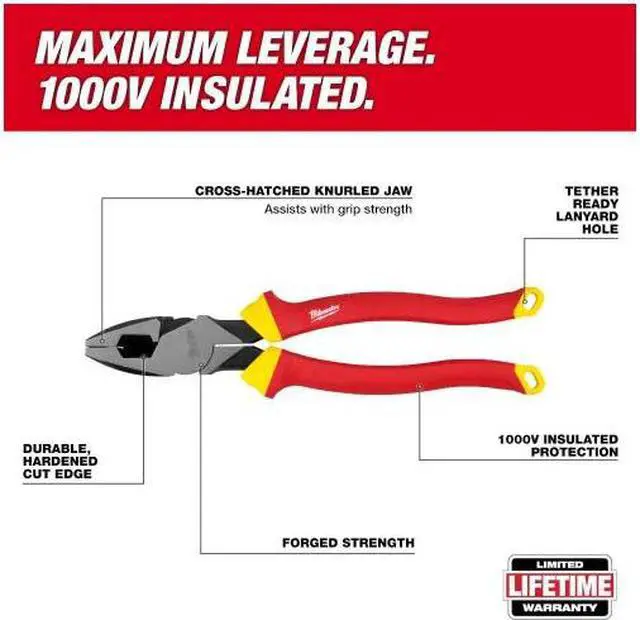 The MILWAUKEE® 1000V Insulated 9" Linemans Pliers provide maximum leverage for easy cuts. The flame retardant 1000V layer of insulation on the handles provides maximum protection. These high-leverage pliers feature hardened iron carbide cutting edges designed to allow you to cut tough jobsite materials like wire and hardware with ease. All Milwaukee® pliers are forged for strength. The Milwaukee® 1000V Insulated 9" Lineman's Pliers are UL classified and are certified to IEC 60900 and ASTM F1505 standards for insulated hand tools and are backed by Milwaukee's Limited Lifetime Warranty.