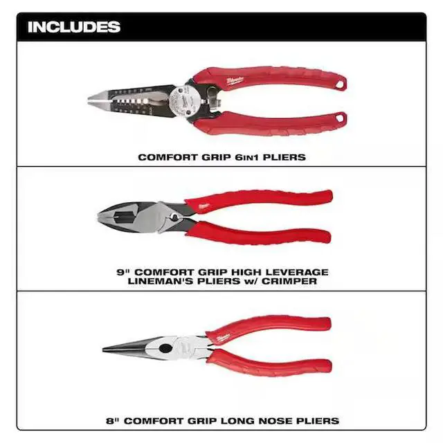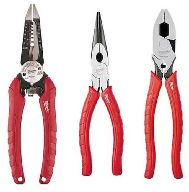 Includes: one 48-22-3079 7.75 in. combination electricians 6-in-1 wire strippers pliers, one 48-22-6100 9 in. high leverage lineman's pliers with crimper, one 48-22-6101 8 in. long nose pliers