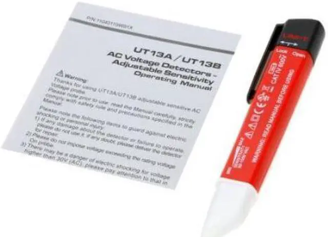 UNI-T UT13B AC Voltage Detectors Adjustable Sensitivity 50-1000ACV Features:Adjustable Sensitivity: Beeper Indicattion: Flashing LED light Indication: Vibration Indication: Low Battery Indication: 1.0VNCV Detection By: Auto SenseSpecifications:Model: UT13BAC Voltage (V): 50 V~ 1000 VFrequency (Hz): 50/60HzGeneral Characteristic:Power: 1.5V Battery (R03)1(not included)Product Colour: Red and GreyProduct Net Weight: 29g / 1ozProduct Size: 15 * 3 * 2cm / 5.9 * 1.2 * 0.8inPackage Size: 23 * 10 * 2cm / 9.1 * 3.9 * 0.8inPackage Weight: 63g / 2.2ozPackage list:1 * UNI-T UT13B AC Voltage Detectors1 * English User Manual