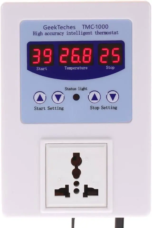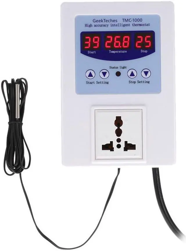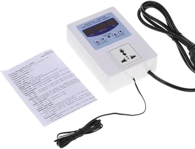 Specifications:Power Supply: AC 110V-240VDisplay: LED Digital TubeTemperature Measuring Range: -9C~99CControl Precision: 1CMeasuring Accuracy: 0.1CResolution: 0.1CRefresh Rate: 0.5sTemperature Calibration Range: (+/-)9CMeasurement Input: NTC(10K0.5%)Waterproof Type SensorOutput: Relay 10A One LoadStatic Current: less than 40mAAttraction Current: less than 65mAWorking Environment: -10C~60C, Humidity 20%~85%Working Modes: Heating or Cooling Mode Power Cable Length: Approx. 150cm / 59inItem Size: 140 * 98 * 44mm / 5.5 * 3.86 * 1.7inItem Weight(with Sensor and Power Plug): 320g / 11.3ozPackage Size: 20 * 13 * 5.5cm / 7.87 * 5.12 * 2.16inPackage Weight: 394g / 13.9oz Features: Show the measured temperature, start temperature and stop temperature at the same time. Digital tube LED display for clear readings, 4 buttons for easy operation. Pre-wired cord with a plug, plug and play design for convenient use. Heating/refrigeration modes, users can set the start/stop temperature freely. Temperature measuring range: -9C~99C; resolution: 0.1C. Also with temperature calibration function. Indicator light for indicating working status. Suitable for a wide range of applications, such as fish tank, floor heating, green house, etc.