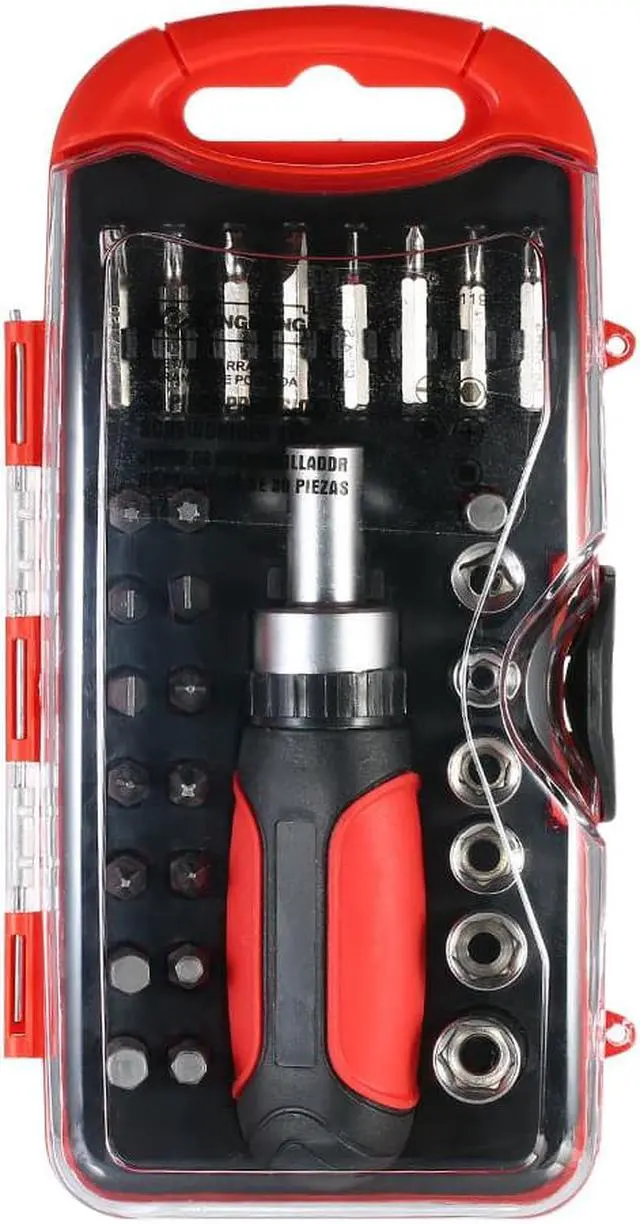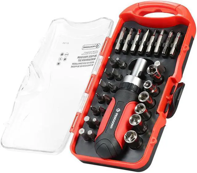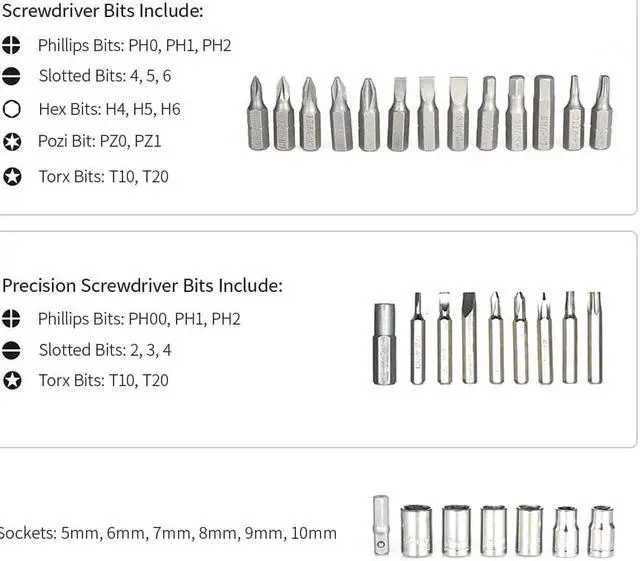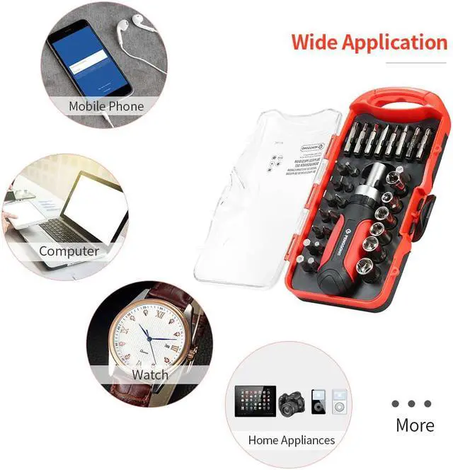 Specifications:Color: Red + Black + SilverMaterial: PP + Chrome Vanadium Steel(CR-V 6150#)Hardness: HRC52-56Screwdriver Bits Include: --Phillips Bits: PH0, PH1, PH2--Slotted Bits: 4, 5, 6--Hex Bits: H4, H5, H6 --Torx Bits: T10, T20--Pozi Bit: PZ0, PZ1Sockets: 5mm, 6mm, 7mm, 8mm, 9mm, 10mmPrecision Screwdriver Bits Include:--Phillips Bits: PH00, PH1, PH2--Slotted Bits: 2, 3, 4 --Torx Bits: T10, T20Handle Length: 105mmPackage Size: 19 * 10 * 4cm / 7.5 * 3.9 * 1.6inPackage Weight: 372g / 13.1oz This sockets screwdrivers set is the necessary tool for various types of electrical work or other repair work. This precision screwdrivers set is designed for repairing, opening or disassembling cellphone, computer, watch, laptop, android phones, laptops, tablets and game console.Features:Includes 13pcs screwdriver bits, 6pcs sockets and 8pcs precision screwdriver bits to meet different demands.Plug-pull tip design, easy to install and replace the bits, time-saving and efficient.Ergonomic and non-slip handle for easy operation, maximum comfort and exceptional torque.Made of chrome-vanadium steel, hardened for maximum wear resistance, durable and high quality.Perfect for working for mobile phone, computer, watch, pad, home appliances and more.All tools are well protected by a case, convenient to carry and portable for use.With a hanging ring, convenient to hang on the wall.