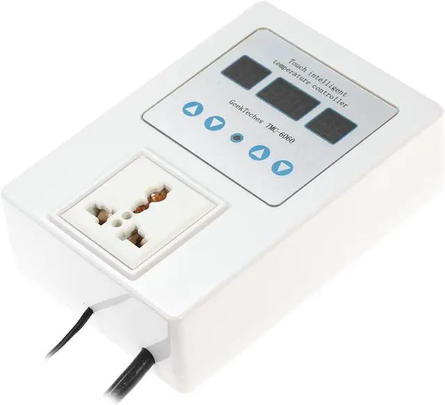 Specifications:Brand Name: GeekTechesPower Supply: AC 110V-240VColor: WhiteMaterial: ABSProbe Model: NTC 10K 0.5% Waterproof Probe Display: LED Digital Tube Triple DisplayTemperature Control Range:-9~99 / 15.8~210.2Temperature Accuracy:0.1 Resolution: 0.1Precision of Temperature Control: 1Return Difference Accuracy: 1 Refresh Rate: 0.5 secondControl: Touch ControlOutput: Relay 10A One LoadWorking Temperature: -10~60(14~140), humidity from 20% to 85% Power Dissipation: static current40mA, dynamic current65mAWorking Modes: Heating or Cooling Mode Power Cable Length: Approx. 150cm / 59inItem Size: 143 * 98 * 43mm / 5.63 * 3.86 * 1.69inItem Weight: 336g / 11.86ozPackage Size: 20.5 * 14 * 7.2cm / 8.07 * 5.51 * 2.83inPackage Weight: 431g / 15.21oz This professional temperature controller features pre-wired cord with a plug to install in your electrical socket, a output socket to plug your appliance and the LED display shows current temperature and start/stop temperature. This device is very easy to set up and adjust, switch to heating or cooling mode freely. It is very accurate in keeping the temperature at the desired level. Plug and play design, easy to use. It is suitable for freezer, conditioner, greenhouse, dog house, incubators, etc.Features:Display the current temperature, start temperature and stop temperature at the same time.4 touch buttons for easy operation to control temperature intelligently.With large and clear LED triple display for better readability.Pre-wired cord with a plug, plug and play design for convenient use.Heating/refrigeration modes, you can set the start/stop temperature freely.3 Control mode of intermittent time, countdown time and appointment time.Wide temperature measuring range -9~99 (15.8~210.2), resolution: 0.1. Support brown-out storage(Set parameters is still valid after short circuit).Also with temperature calibration and delay protection function.Indicator light for indicating working status.Suitable for a wide range of applications, such as fish tank, floor heating, greenhouse, etc.