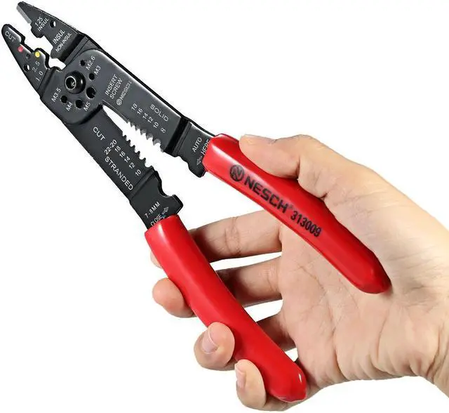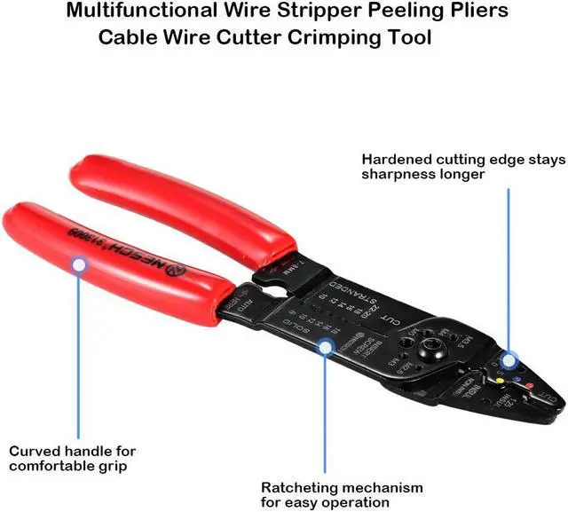 Specifications:Color: Red + blackMaterial: SteelItem Size: Approx. 21.5 * 5.6 * 1.6cm / 8.5 * 2.2 * 0.6inItem Weight: Approx. 191g / 6.7ozPackage Size: Approx. 27.8 * 8.9 * 1.8cm / 10.9 * 3.5 * 0.7inPackage Weight: Approx. 221g / 7.8oz Features:Built-in ratcheting mechanism for easy operation.Ergonomic curved handle for comfortable grip when cutting.Can crimp insulated and non-insulated terminals.With hardened cutting edge stays sharpness longer.Just hold the handle and operate it once to successfully strip the wire.Best handle grasping position and compact structure ensure perfect crimping effect.