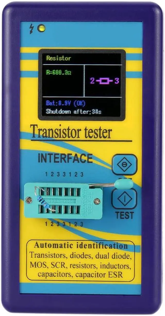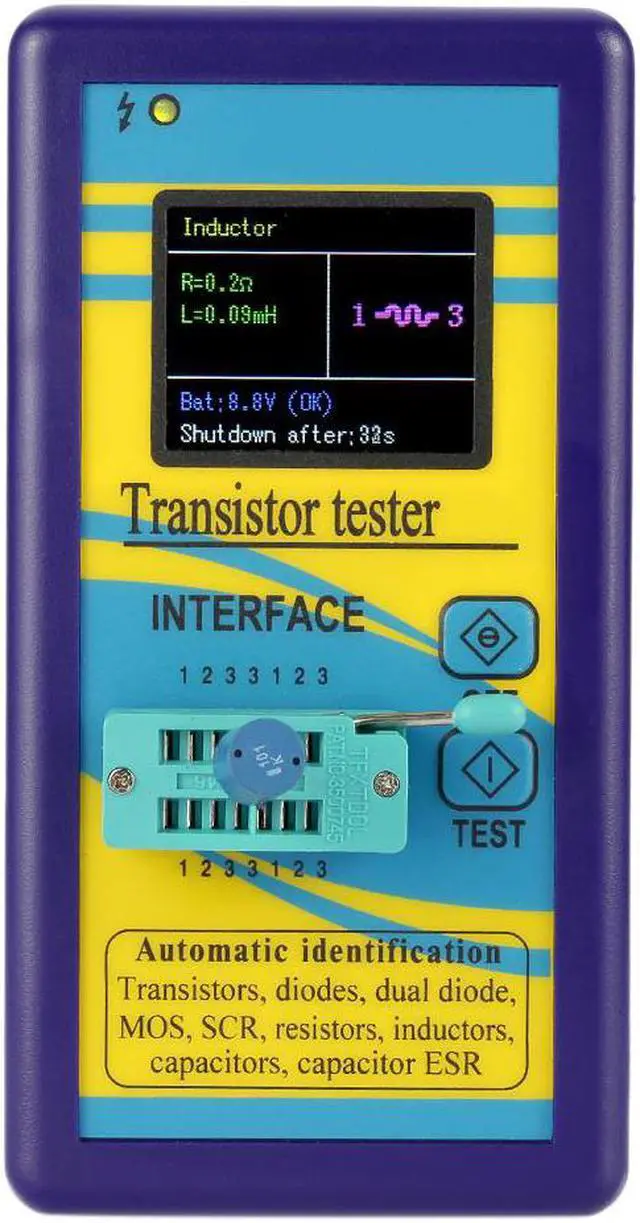Note:Please make sure that capacitors are discharged before testing.Specifications:Case Color: PurpleDisplay: 1.8" TFT Color DisplayMaterial: PCB + PlasticShutdown Current: 20nAResistor Test Range: 0.5-50MInductor Test Range: 0.01mH-20HCapacitor Test Range: 25pF-100000uFItem Size: 13.5 * 7 * 2.2cm / 5.3 * 2.76 * 0.86in Item Weight: 99g / 3.5ozPackage Size: Approx. 16 * 8 * 2.5cm / 6.3 * 3.15 * 0.98inPackage Weight: 102g / 3.61oz Features:128*160 TFT color display for easy readings, can display measured data and graphics.Powered by 9V battery(not included).All components are protected by a plastic case, convenient to carry.Automatically detect NPN and PNP transistors, N-channel and P-channel MOSFET, diodes, thyristors, resistors, capacitors or other devices.Automatically test the pins of a component and display on the LCD.Measure the gate threshold voltage and gate capacitance of the MOSFET.Measure bipolar transistor current amplification factor and base-emitter threshold voltage.Two-button operation, automatic shutdown to avoid unnecessary waste.Short detection time: only 2 seconds. It is normal to cost 1 minute for bulk capacitor detection.