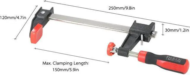 Specifications:Material: high-carbon steelMax. Clamping Length:6 inches: 150mmItem Size:6 inches: 25 * 12 * 3cm / 9.8 * 4.7 * 1.2inPackage Size: 41 * 11 * 4cm Features:Suitable for a wide range of woodworking, machine repair, DIY projects, etc.Anti-slip ergonomics handle provides comfortable and stable operation.Zinc plating rail, not easy to rust.Protective pads for both tops can well protect wood pieces.Made of high-carbon steel.
