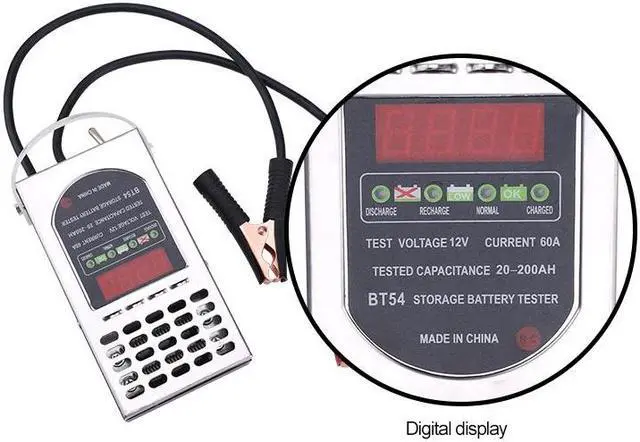 Product Model BT-54A BT-54B BT-54C Current 60A 40A 60A Rated capacitance 32-195AH 10-150AH 32-195AH Battery voltage 6-12V 12V 12V Test speed 5S 5S 5S Display mode Pointer Pointer Pointer Housing material stainless iron stainless iron stainless iron Dimensions 200*110*40mm Weight Approximate 0.75kg 1. Before using it, please carefully check whether the pointer of the device is at the "0" position, if not, please rotate the zero regulator to adjust the pointer to 0 position.2. Ensure that pressing the test switch for less than 5 seconds when check the device.3. The battery can't be detected when the liquid is insufficient.4. In series connection of 12v and 24V circuit during testing is prohibited.